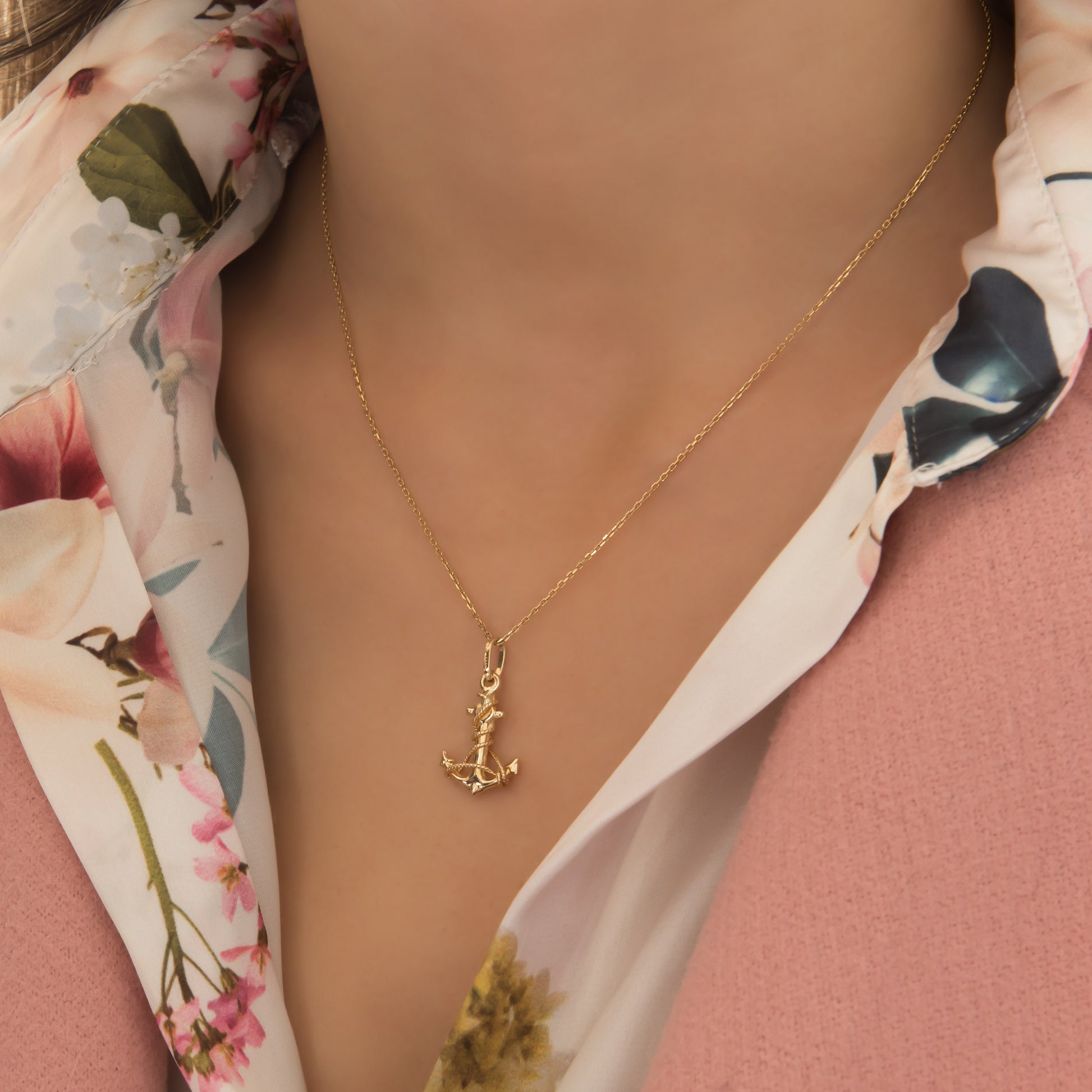 A delicate anchor pendant necklace crafted in solid gold with refined, intricate detailing.