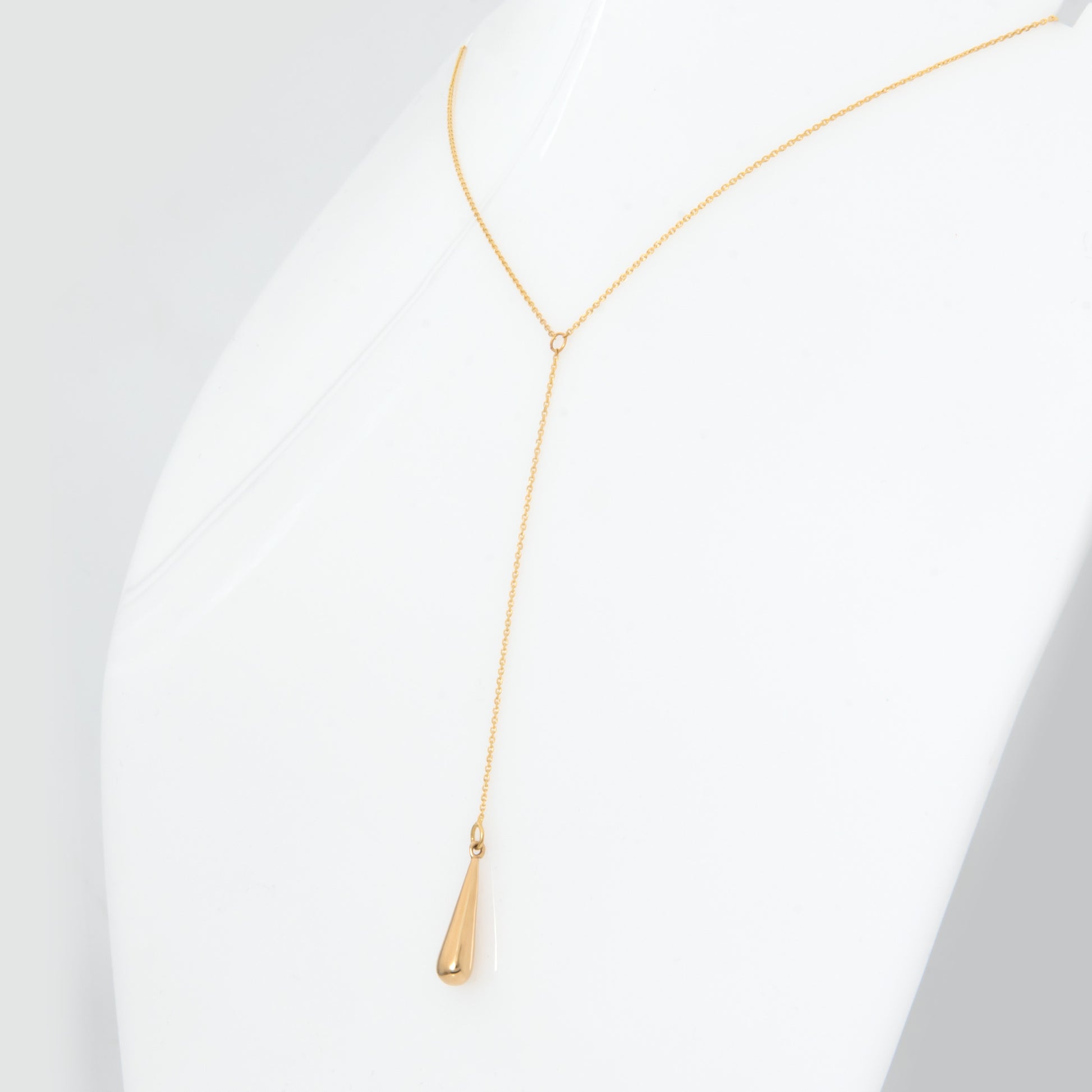 This elegant lariat necklace features a solid gold teardrop pendant that gently drops from a fine, elongated chain, available in 9K and 14K yellow gold. Its refined and minimal design creates a graceful, flowing silhouette, offering a touch of sophistication to any outfit. A timeless and luminous piece, perfect for both everyday wear and special occasions.