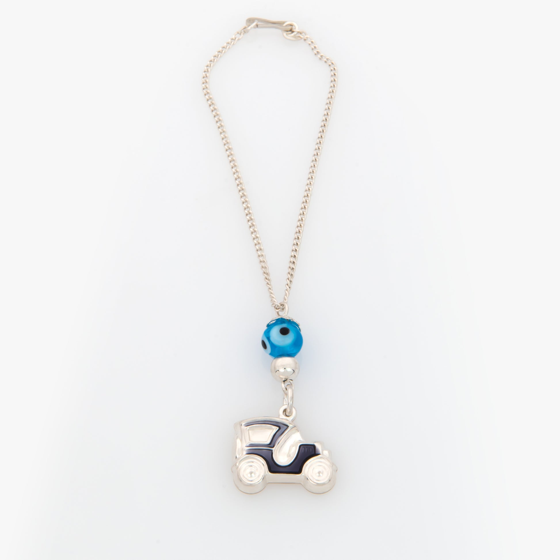 This Lucky car charm is crafted from sterling silver 925 and features an antique car-shaped charm finished with black enamel. A delicate chain accented with an evil eye bead completes the design. Traditionally hung from the car’s rearview mirror, it adds a playful yet meaningful touch, symbolizing protection and good luck on every journey.